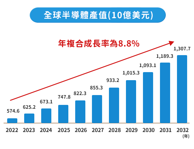 資料來源: market.us、國泰投信整理,2025/4;2032年全球半導體產值預估達1.3兆美元。本文提及產業或投資標的,僅為說明之用,不代表本基金之必然持股或投資標的,亦不代表任何金融商品的推介或建議。投資人申購本基金係持有基金受益憑證,而非本文提及之投資資產或標的。投資人因不同時間進場,將有不同之投資績效,過去之績效亦不代表未來績效之保證。
