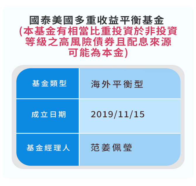 (1)本基金美元-配息B及同類型基金(Morningstar系統之投信投顧公會分類之債券股票平衡-跨國投資-跨國投資-單一國家型)之排名(報酬率)/檔數(報酬率)分別為:近3個月第3名(報酬率7.76%)/22檔(報酬率0.04%),近6個月第7名(報酬率3.20%)/22檔(報酬率0.09%),資料來源:Morningstar,2025/7/31。(2)當期配息率計算方式:每單位配息金額÷ 除息日前一日之淨值。當期報酬率(含息)是將該收益分配期間所分配之收益均假設再投資於本基金之累計報酬率。計算方式為[(當次除息日淨值+每單位配息金額)÷前次除息日淨值-1]×100%。(3)基金配息不代表基金實際報酬,且過去配息不代表未來配息;基金淨值可能因市場因素而上下波動。(4)配息資料來源:國泰投信, 2025/7//31。