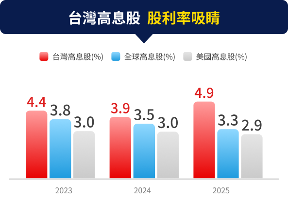 注意:(1)上述各指數皆為價格指數,指數僅供參考用途,指數之歷史績效不應被視為現在或未來表現及績效的保證,且指數之殖利率不代表基金之實際配息率,亦不代表基金現在或未來之實際報酬率。 (2)左圖台灣成長股為MSCI台灣成長股指數、台股大盤為台灣加權價格指數,資料期間 2016/01~2025/12 。(3)右圖台灣高息股為富時臺灣證券交易所臺灣高股息指數,全球高息股為MSCI全球高股息指數 、美國高息股為MSCI美國高股息指數,資料為2023、2024、2025年度股利率統計資料。(4)資料來源:Bloomberg,國泰投信整理,2026/01。