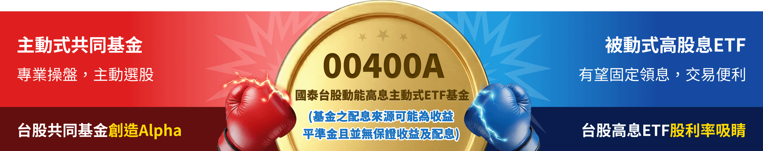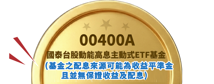 注意:(1)主動國泰動能高息(基金之配息來源可能為收益平準金且並無保證收益及配息)為國泰台股動能高息主動式ETF基金(基金之配息來源可能為收益平準金且並無保證收益及配息)之證券簡稱(證券代碼:00400A);本基金投資所得之現金股利、稅後利息收入、基金受益憑證之收益分配及本基金因出借有價證券而由借券人返還之現金股利及租賃所得,扣除本基金應負擔之各項成本費用後,以及收益分配權最後交易日累積之收益平準金為本基金之可分配收益,其他所得如符合(A)規定者,得由經理公司決定是否增配。上述可分配收益,由經理公司依(B)規定進行收益分配,惟如經理公司認為必要時,可於分配前隨時修正收益分配金額。(A)前述可分配收益若另增配已實現資本利得扣除資本損失(包括已實現及未實現之資本損失)及本基金應負擔之費用時,則本基金於收益分配評價日之每受益權單位之淨資產價值應高於信託契約第5條第1項第2款所列本基金每受益權單位之發行價格,且每受益權單位之淨資產價值減去當次每受益權單位可分配收益之餘額,不得低於本基金每受益權單位之發行價格。(B)本基金可分配收益之分配,應於本基金成立日起屆滿60日(含)後,每月第20個日曆日為收益分配評價日(如遇例假日,則以前一營業日為準),經經理公司作成收益分配決定後,於每月結束後第45個營業日前(含)進行分配;收益分配之停止變更受益人名簿記載期間及收益分配基準日由經理公司於期前公告。本基金每受益權單位之可分配收益,應經金管會核准辦理公開發行公司之簽證會計師出具查核簽證報告後,始得分配。倘可分配收益未涉及資本利得時,得以簽證會計師出具核閱報告後進行分配。本基金投資之企業,其股利(股息)配發時間及金額視個別企業決定(如該企業一年可能集中於一次或兩次配發),故每期配息金額之決定主要透過對投資組合企業長期股利配發記錄的追蹤作為未來一年股利金額的保守預估,並考量相關稅負後,方決定每期基金每單位的配息金額。 (2)本基金為主動式交易所交易基金,主要投資於國內上市及上櫃股票,其中又以高股息股票或具成長動能之個股為主。可能面臨之投資風險包含類股過度集中之風險、產業景氣循環之風險、流動性風險、投資地區政治、經濟變動之風險等。本基金相較同類型基金過去5年淨值波動度相當,且依據基金主要投資地區與投資市場特性,並參酌投信投顧公會「基金風險報酬等級分類標準」(下稱RR)等因素綜和考量後,其風險報酬等級為RR4*。*風險報酬等級為經理公司依照投信投顧公會「基金風險報酬等級分類標準」編製,該分類標準係計算過去5年基金淨值波動度標準差,以標準差區間予以分類等級,分類為RR1-RR5五級,數字越大代表風險越高。此等級分類係基於一般市場狀況反映市場價格波動風險,無法涵蓋所有風險(如:基金計價幣別匯率風險、投資標的產業風險、信用風險、利率風險、流動性風險等),不宜作為投資唯一依據,投資人仍應注意所投資基金個別的風險。請投資人注意申購基金前應詳閱公開說明書,充分評估基金投資特性與風險,更多基金評估之相關資料(如年化標準差、Alpha、Beta及Sharpe值等)可至投信投顧公會網站之「基金績效及評估指標查詢專區」( https://www.sitca.org.tw/index_pc.aspx)查詢。