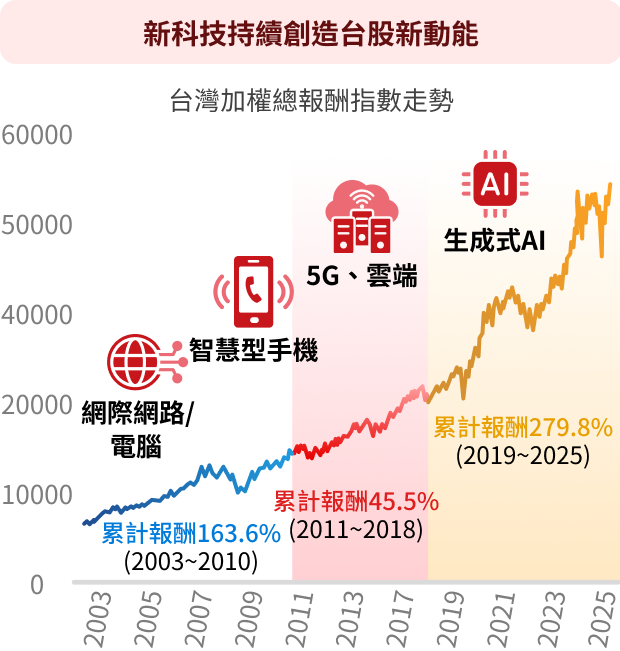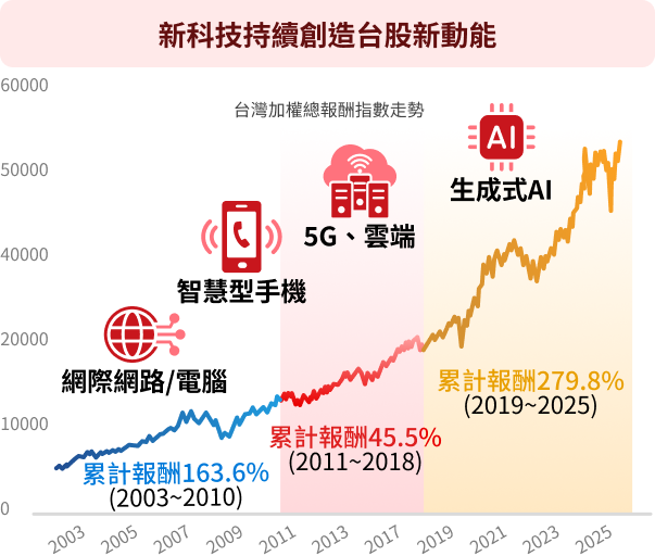 注意:(1)本文提及產業或投資標的僅供說明之用,不代表任何金融商品的推介或建議,亦不代表未來基金之必要投資標的,實際配置以基金成立後,官網公告為準。投資人申購本基金係持有基金受益憑證,而非本文提及之投資資產或標的。 (2)左圖為台灣加權總報酬指數(含息),右圖為台灣加權價格指數(不含息),上述各指數僅供參考用途,指數之歷史績效不應被視為現在或未來表現及績效的保證,亦不代表基金現在或未來之實際報酬率。(3)指數累積報酬率=(資料期間各月底指數值/期初首月底指數值) -1。(4)統計2021年-2025年勝過大盤之個股檔數及台股總檔數分別為:680/1,711(2021年);1,190/1,760(2022年);757/1,803(2023年);407/1,870(2024年);296/1,944(2025年)。資料來源:Bloomberg,國泰投信整理,2026/01。