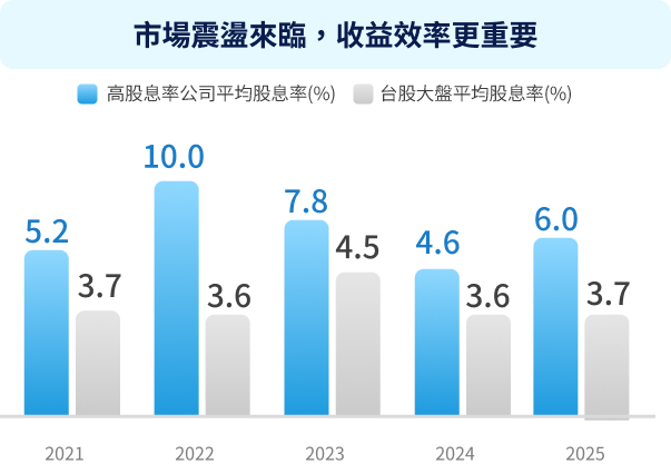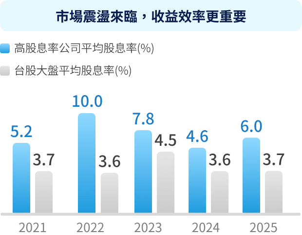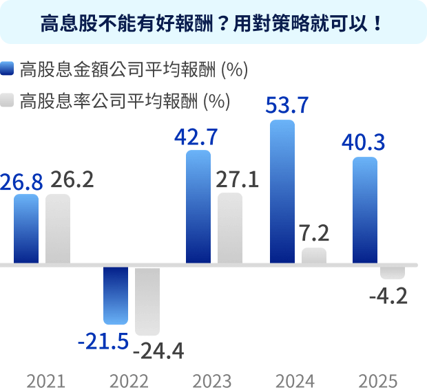 注意:(1)左圖高股息金額公司是依據2021年~2025年當年度10月底結算之公司「近四季現金股利」排序前50%之個股,並依照市值加權計算平均報酬率;高股息率公司是依據2021年~2025年當年度10月底結算之公司「近四季現金股利/10月底個股收盤價」排序前50%之個股,並依照市值加權計算平均報酬率。右圖為高股息率公司平均股息率是依據2021年~2025年當年度10月底結算之公司「近四季現金股利/10月底個股收盤價」排序前50%之個股,並依據市值加權計算平均股息率;台股大盤平均股息率的計算方式以2021~2025各年度10月底的數據,並自該時間點回溯一年進行計算。上述歷史績效不應被視為現在或未來表現及績效的保證,且指數之股利率不代表基金之實際配息率,亦不代表基金現在或未來之實際報酬率。基金配息不代表基金實際報酬,且過去配息不代表未來配息,基金淨值可能因市場因素而上下波動。(2)資料來源:Bloomberg,國泰投信整理,2026/01。