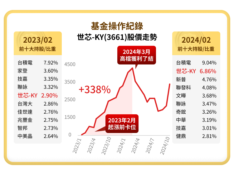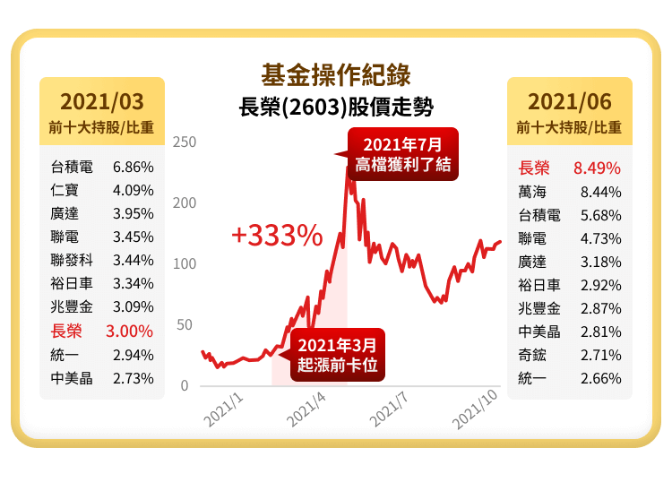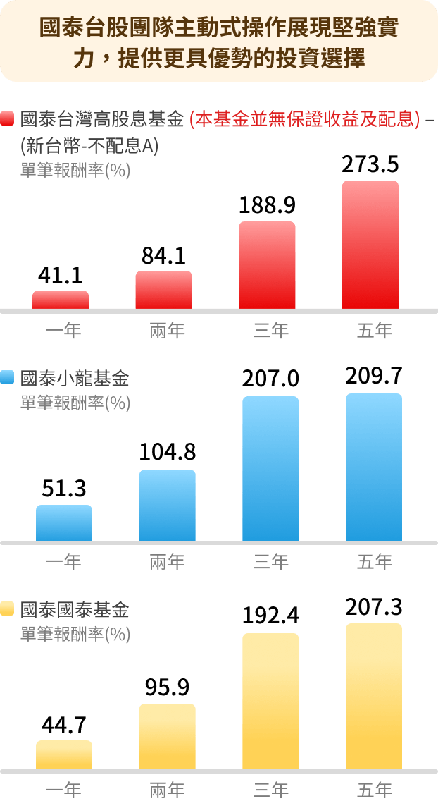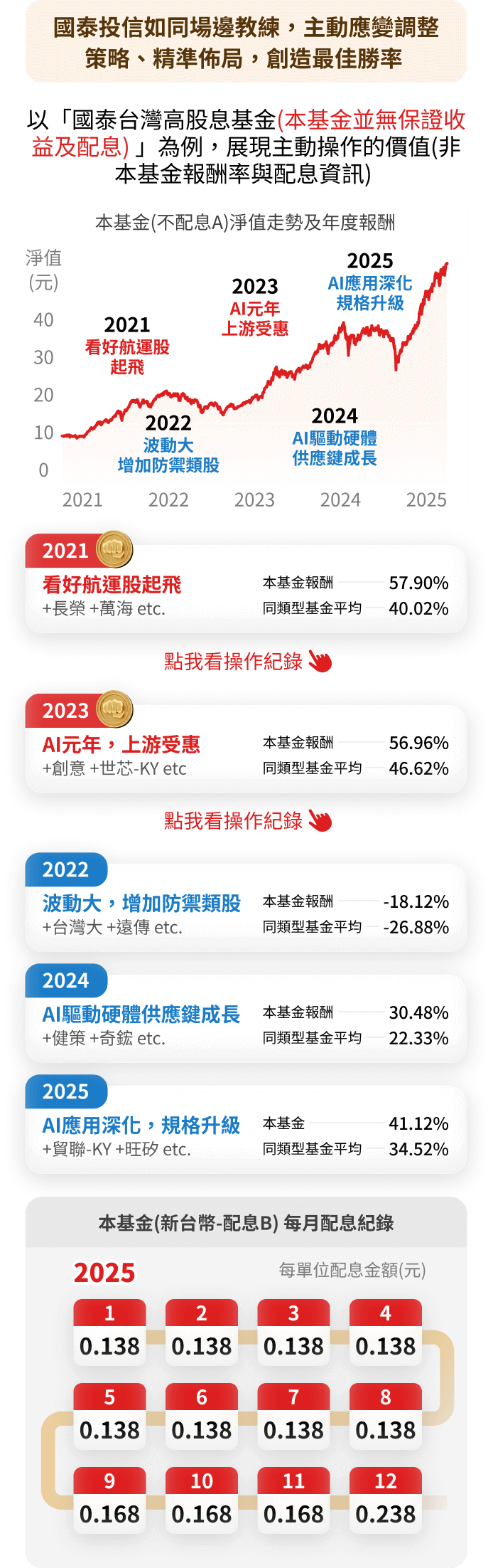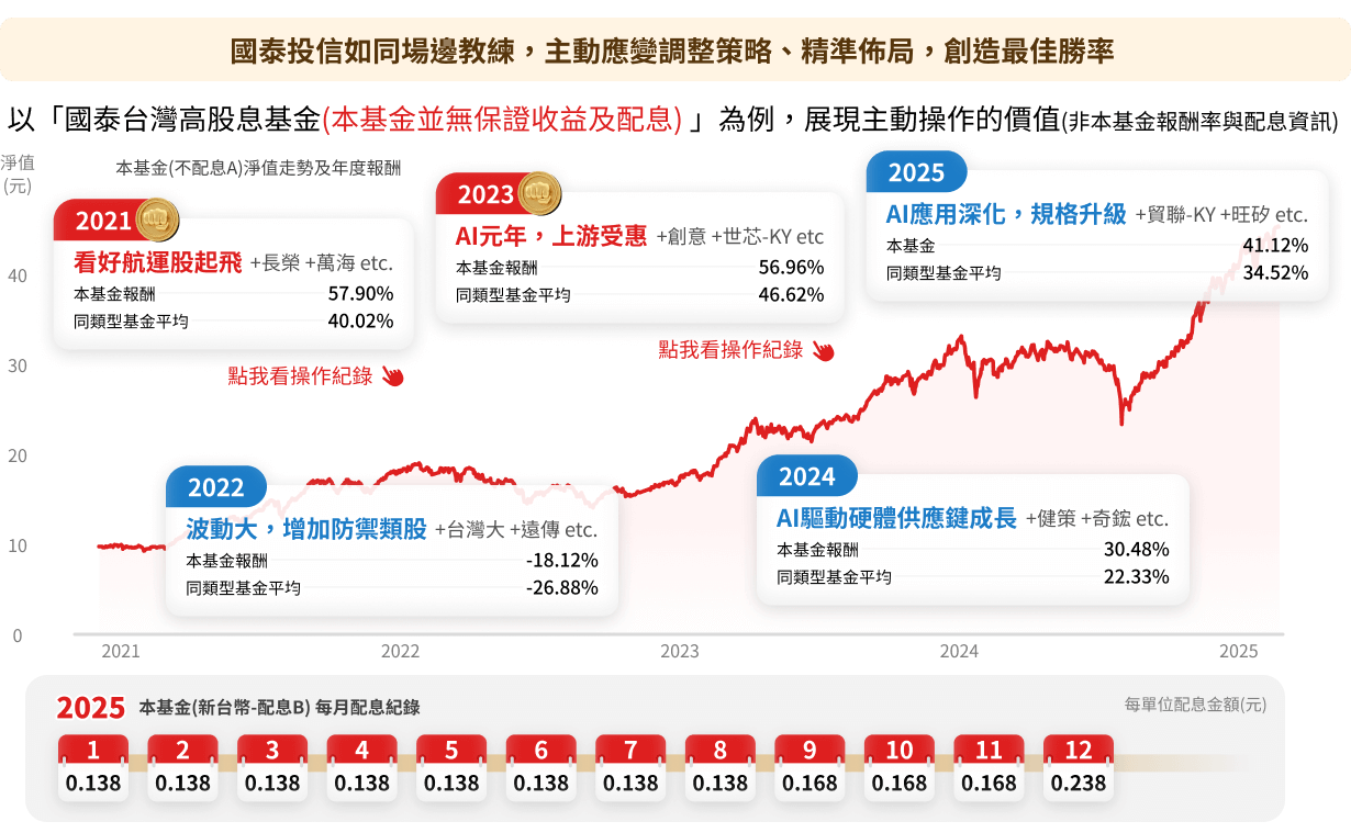 注意: (1) 國泰台灣高股息基金(本基金並無保證收益及配息)(新台幣)- 不配息A及同類型基金(投信投顧公會分類之股票型-投資國內)之各年度排名及檔數分別為:第29名/185檔(2021年),第28名 /201檔(2022年),第56名 /223檔(2023年),第57名 /240檔(2024年),第112名 /260檔(2025年)。本基金B類型受益權單位投資所得之現金股利、稅後利息收入及基金收益分配扣除B類型受益權單位應負擔之各項成本費用後為B類型受益權單位之可分配收益・另本基金B類型受益權單位投資之已實現資本利得扣除資本損失(包括已實現及未實現之資本損失)與B類型受益權單位應負擔費用後之餘額如為正數時,亦可併入本基金B類型受益權單位之可分配收益。上述可分配收益,應於本基金成立日起屆滿 3個月後,以每月最後日曆日為評價日,經經理公司作成收益分配決定後,於每月結束後之第20個營業日前(含)分配之;收益分配之停止變更受益人名簿記載期間及收益分配基準日由經理公司於期前公告。本基金B類型受益權單位可分配收益,應經金管會核准辦理公開發行公司之簽證會計師查核簽證後,始得分配。倘可分配收益未涉及資本利得,得以簽證會計師出具核閱報告後進行分配。本基金投資之企業,其股利(股息)配發時間及金額視個別企業決定(如該企業一年可能集中於一次或兩次配發),故每月配息金額之決定主要透過對投資組合企業長期股利配發記錄的追蹤作為未來一年股利金額的保守預估,並考量相關稅負後,方決定每月基金每單位的配息金額。 (2)本文提及個股或產業或投資標的,僅為說明之用,不代表基金之必然持股或投資標的,亦不代表任何金融商品的推介或建議。投資人申購基金係持有基金受益憑證,而非本文提及之投資資產或標的。(3)內容所載之投資策略為現階段因應市場狀況所擬定,未來仍可能隨市場之變化彈性調整投資策略。(4)基金之歷史績效不應被視為現在或未來表現及績效的保證。(5)基金配息不代表基金實際報酬,且過去配息不代表未來配息;基金淨值可能因市場因素而上下波動。基金配息組成項目和完整配息資訊請參閱公開說明書和國泰投信官方網站(https://www.cathaysite.com.tw )。 (6)報酬率=(賣出時該年度之月份出場日股價/買進時該年度之月份進場日股價) -1。(7)資料來源:投信投顧公會、國泰投信,2020/7/10-2025/12/31。