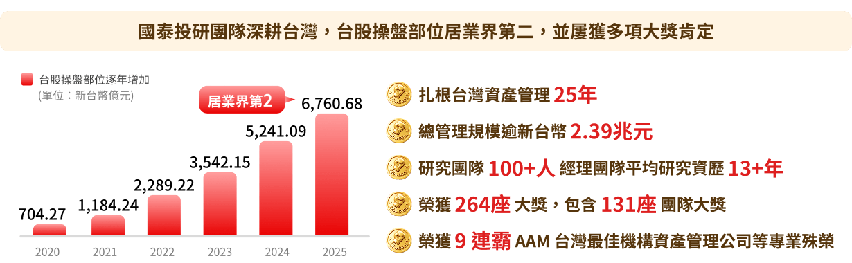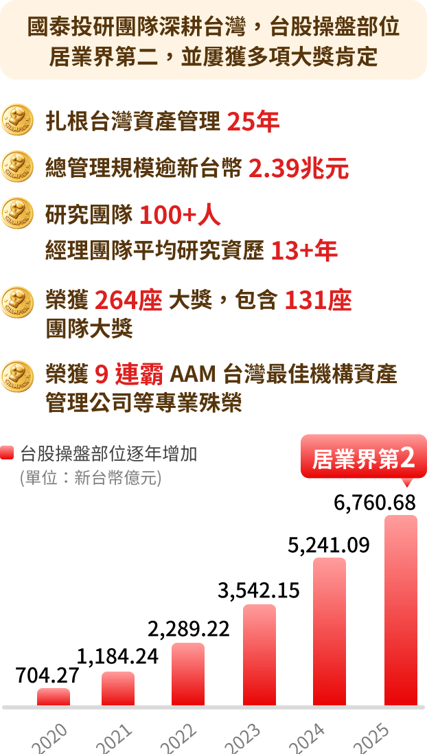 注意:(1)國泰投信台股操盤規模為新台幣676,068,157,255元,包含投信投顧公會之國內投資股票型、國內投資指數股票型_股票型、國內投資指數股票型_槓桿型/反向型之資產,總管理規模包含旗下所有共同基金/ETF之資產及全權委託金額的總合。 (2)上述得獎資料來源:Asia Asset Management、The Asset、Benchmark、Smart智富、台北金融研究發展基金會、Morningstar,欲查詢完整得獎紀錄,請詳見https://cathaysite.tw/w7Vbe0,2026/01。(3)資料來源:投信投顧公會、國泰投信整理,2025/12。